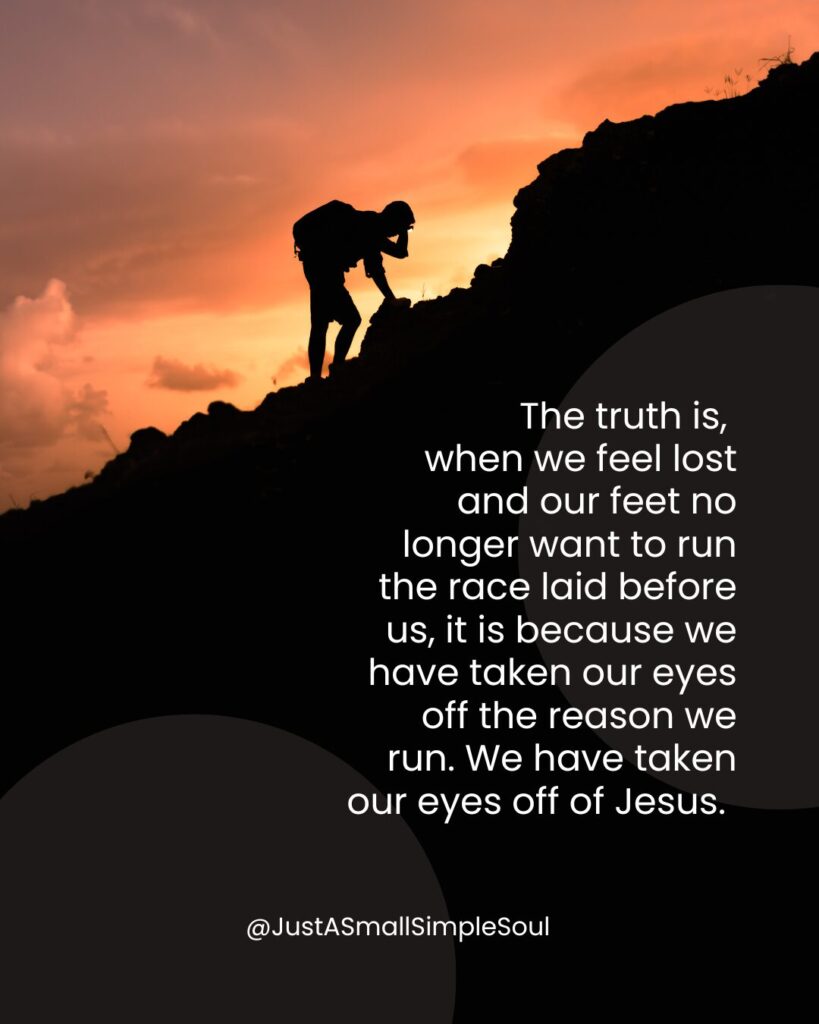 But God never loses sight of us. The truth is, when we feel lost and our feet no longer want to run the race laid before us, it is because we have taken our eyes off the reason we run. We have taken our eyes off of Jesus.